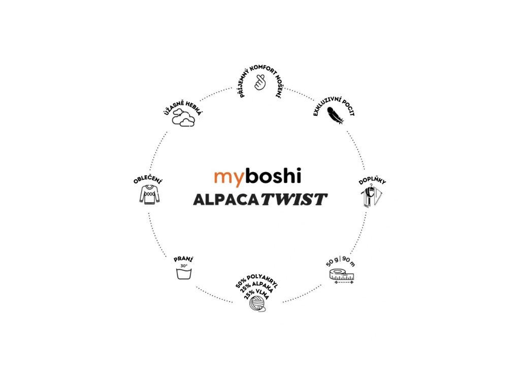 V přízi myboshi Alpaca Twist je tento luxusní přírodní materiál kombinován s polyakrylem a panenskou vlnou. Vzniká tak alpaková příze, která hřeje, zachovává si tvar a snadno se o ni pečuje. Lze ji prát do 30 °C, je ideální pro háčkování a pletení a díky svým robustním vlastnostem je odolná a vhodná pro každodenní použití.