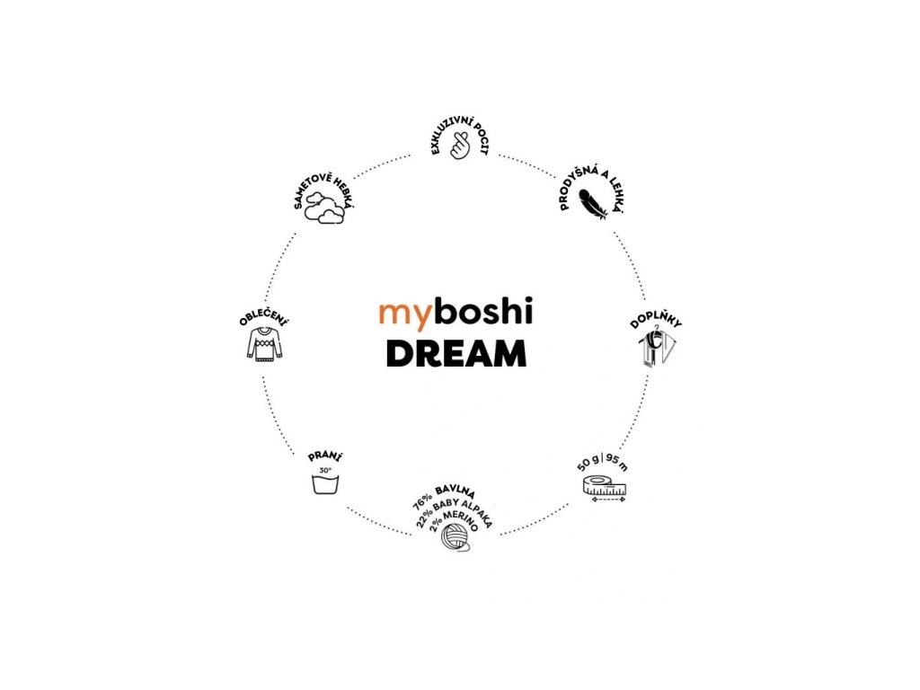 Myboshi Dream je exkluzivní směs přírodních vláken: bavlny, vlny baby alpaka a vlny merino. Tato luxusní příze nabízí výjimečné pohodlí. Díky vysokému obsahu Baby Alpaca je obzvláště měkká, reguluje teplotu a je šetrná k pokožce. Ať už se jedná o vzdušné svrchní oblečení, útulné šály nebo stylové doplňky – tato příze je vaším dokonalým společníkem pro každé roční období.