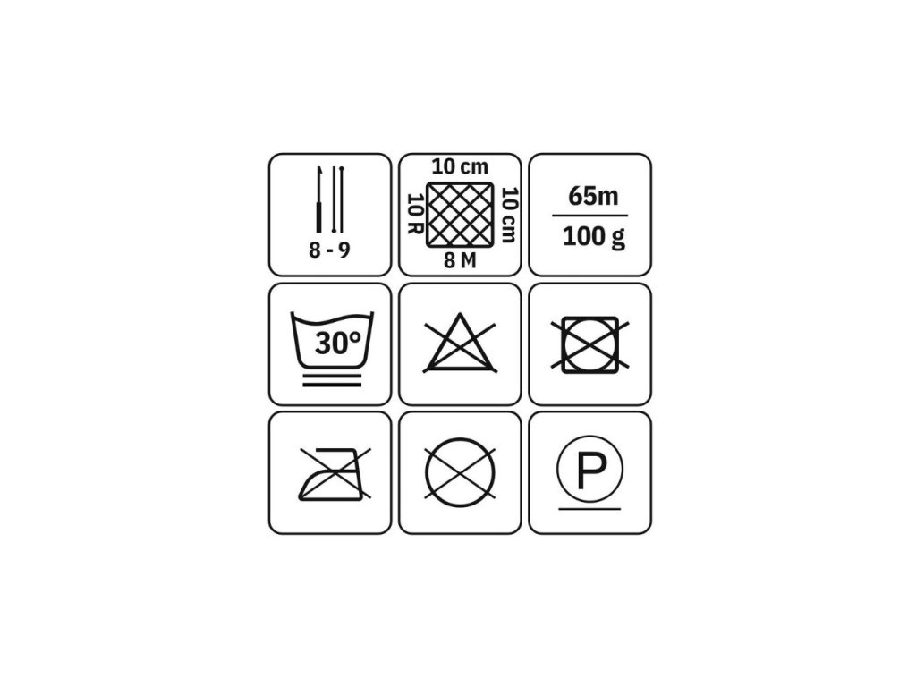 Délka klubka je 65 metrů s hmotností 100 gramů. Pro perfektní výsledky je nejlepší velikost jehlic 8 až 9 mm.