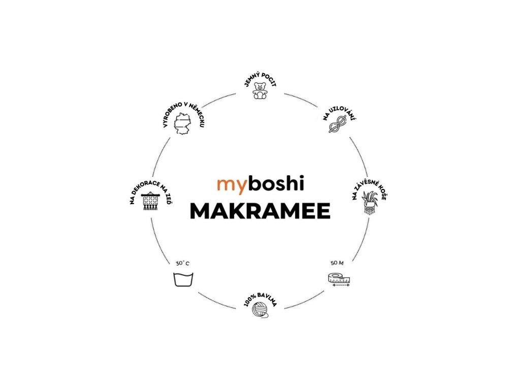 Kroucená příze myboshi Makramee je přírodní produkt prémiové kvality vyrobený ze 100% bavlny. Vyrábí se v Německu a v tloušťce 4mm je na klubku namotaných 50 m šňůry.