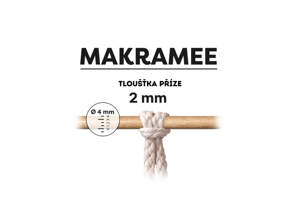 Pletená příze myboshi Makramee je přírodní produkt prémiové kvality vyrobený ze 100% bavlny. Vyrábí se v Německu a v tloušťce 2mm je na klubku namotaných 50 m šňůry.