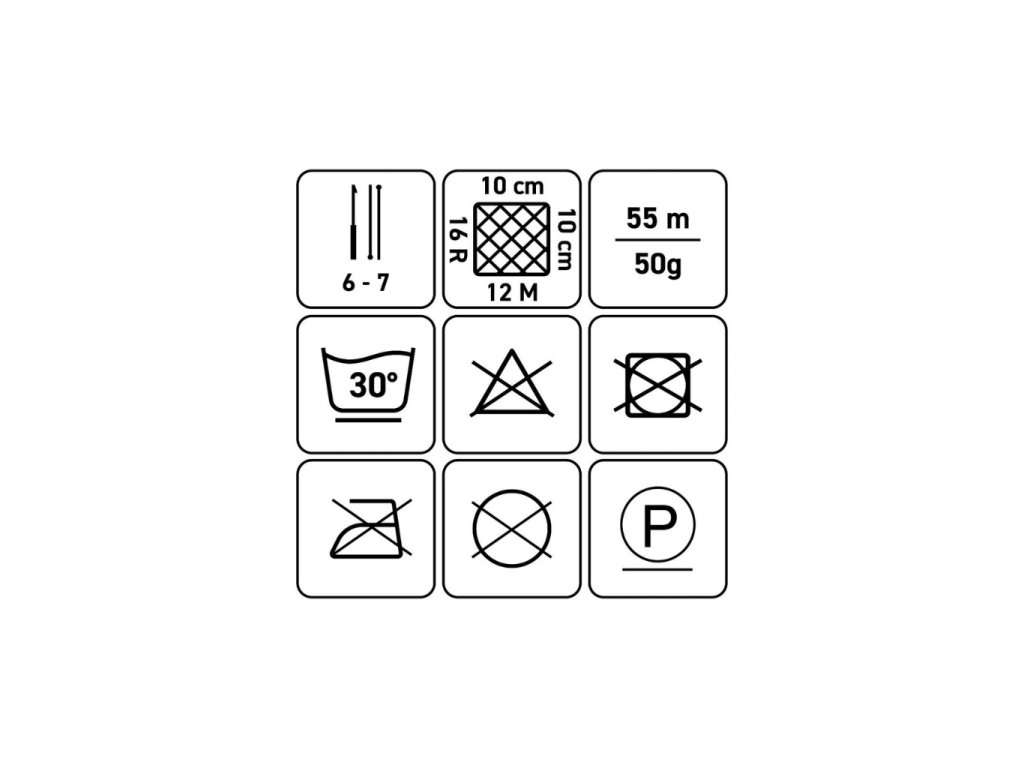 Složení materiálu činí přízi odolnou a zároveň příjemně měkkou. Je rozměrově stabilní, snadno se o ni pečuje, neplstí se ani nežmolkuje, takže je ideální pro začátečníky. Doporučená velikost jehlic je 6–7 mm a délka klubka o hmotnosti 50 g je přibližně 55 metrů – což umožňuje rychlou a efektivní práci.