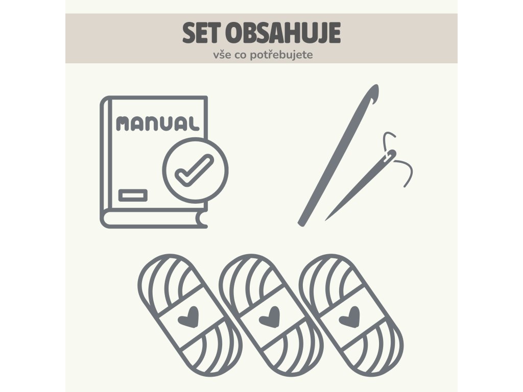 Pokud s háčkováním začínáte nebo hledáte jednoduchý projekt, u kterého můžete vypnout, tento set je pro Vás ideální volbou. Obsahuje to, co potřebujete (kromě nůžek) - nemusíte se tak trápit s výběrem typu/množství příze a přemýšlet, zda Vám něco nechybí.